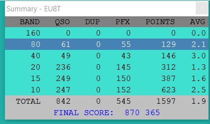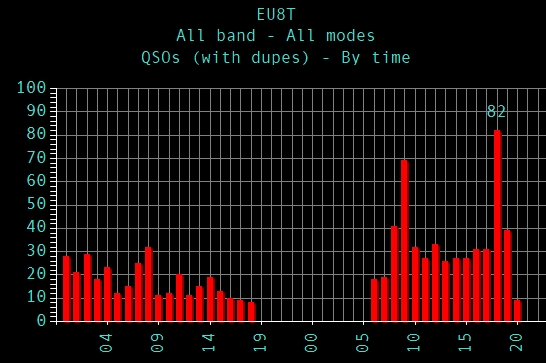 Рейт во второй день получше, но не сказать что феерический, я работаю на полном пофигизме в вперемешку с домашними делами и «поесть». Экспериментирую, проверяю разные идеи. На 10М ко мне подошли все гомельске, был в тесте — 8ML, 8U, 8DX. Поспрашивал, как у них было вчера. (А вдруг это что-то с моим домом не так 🙂 ) Но нет, все отметили «никакой» проход в субботу, кто-то пытался работать, кто-то «забил». Я доработал так же до 8 вечера и забил. Если на «ВЧ» еще отвечали,то на НЧ было все настолько уныло, что не хотелось и продолжать.
