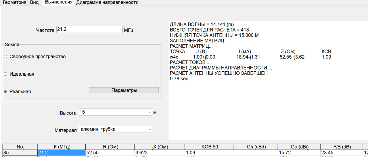 К сожалению, оставленный дома векторный анализатор оставляют много почвы для домыслов,на сколько реальные параметры антенны соответствует модели, так как старый анализатор SW1 Андрея не умет строить графики…
