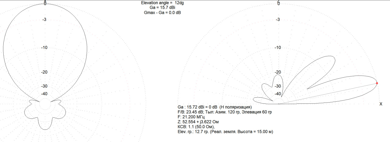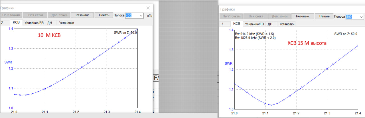 Ксв посмотрели на разных высотах, как и параметры антенны. Оптимизация под 15м вышла жесткая, при снижении высоты с 15 до 10м параметры подавления сильно падают, но